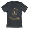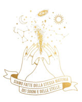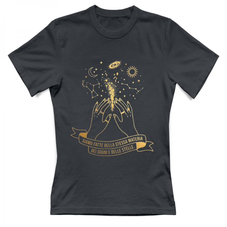 Esprimi la tua magia interiore con questa elegante t-shirt minimalista. La grafica, realizzata con una preziosa stampa dorata metallizzata, raffigura due mani femminili stilizzate che racchiudono un firmamento vibrante di sogni e costellazioni. Un nastro calligrafico sottostante riporta la potente e poetica citazione: 'Siamo fatte della stessa materia dei sogni e delle stelle'.